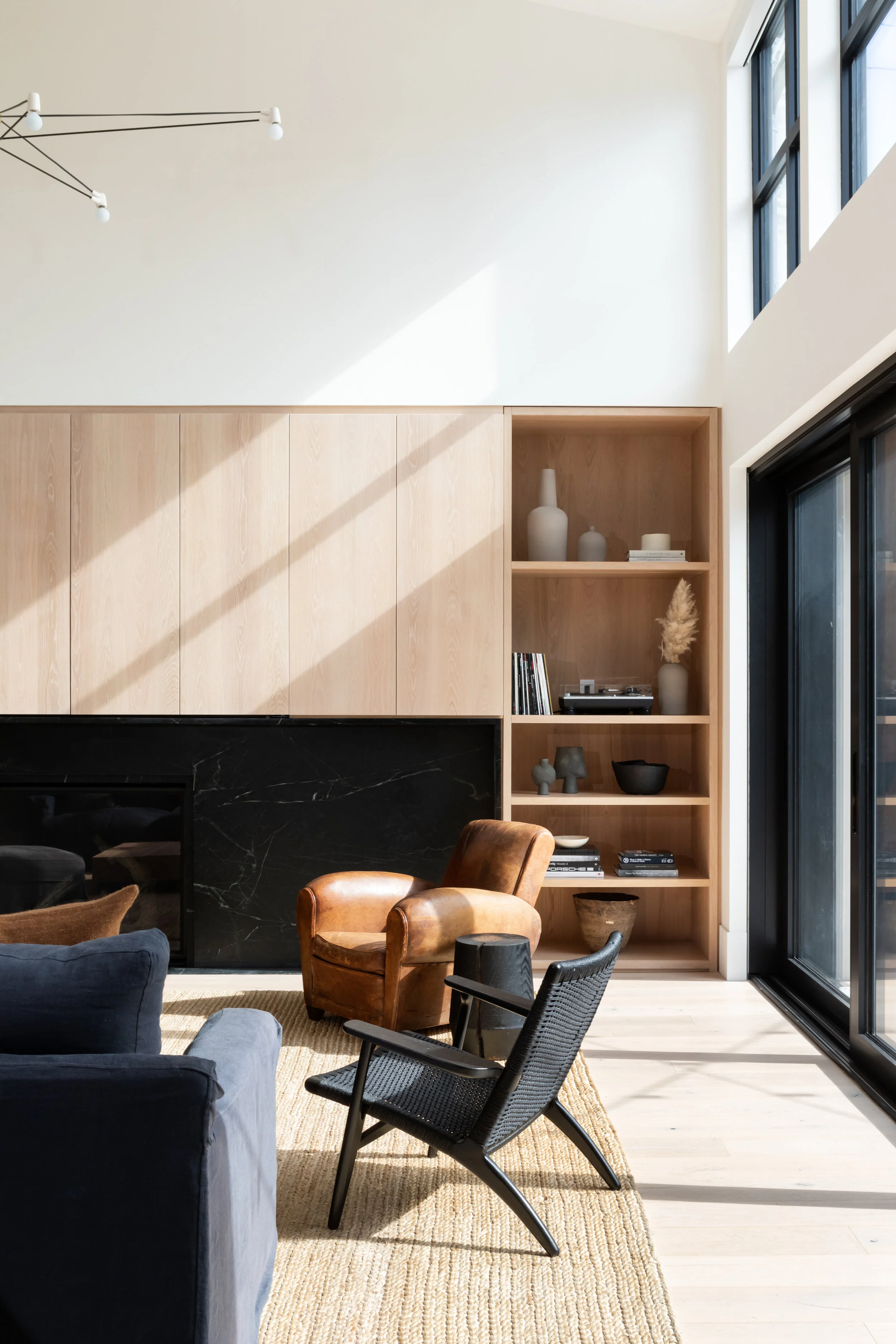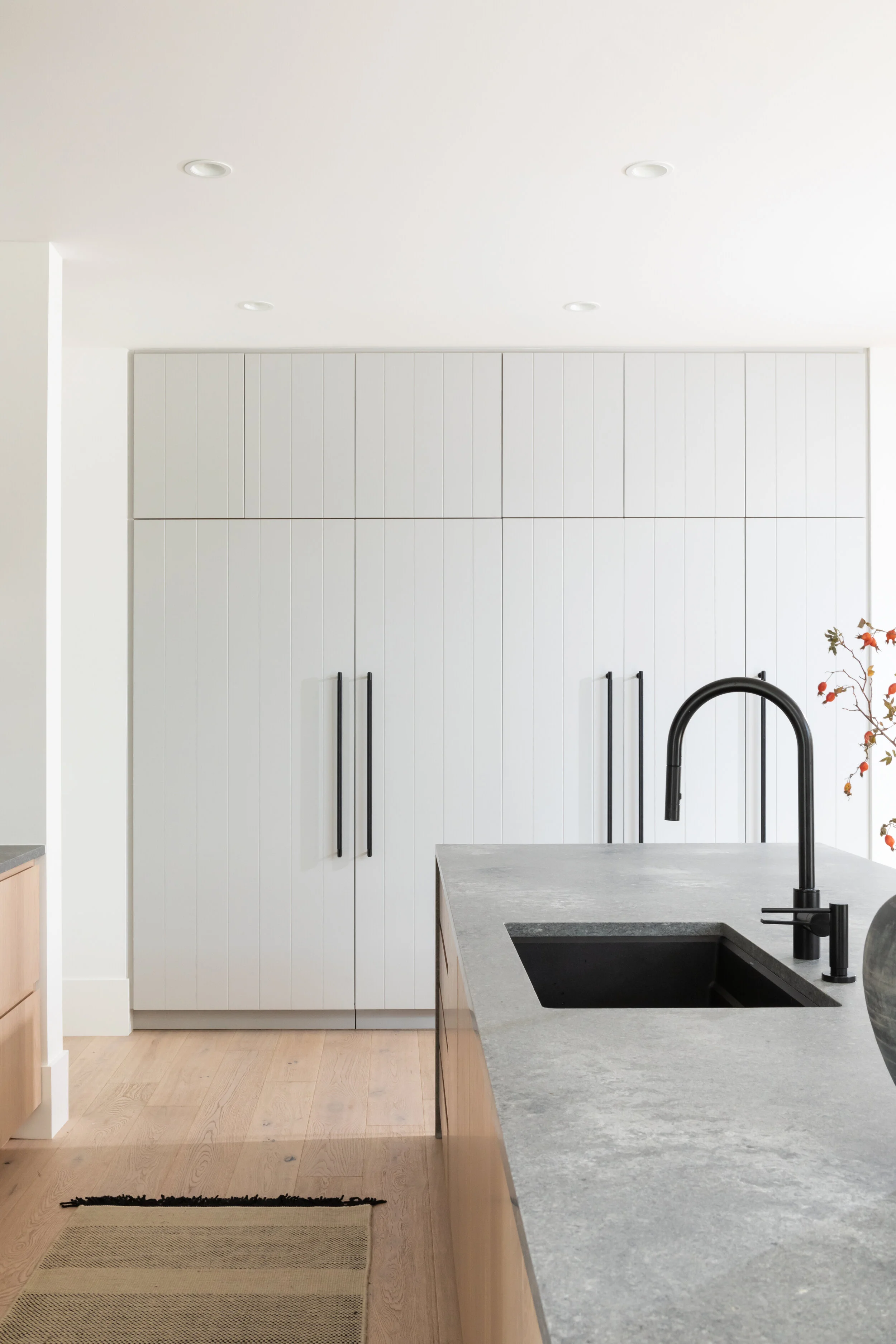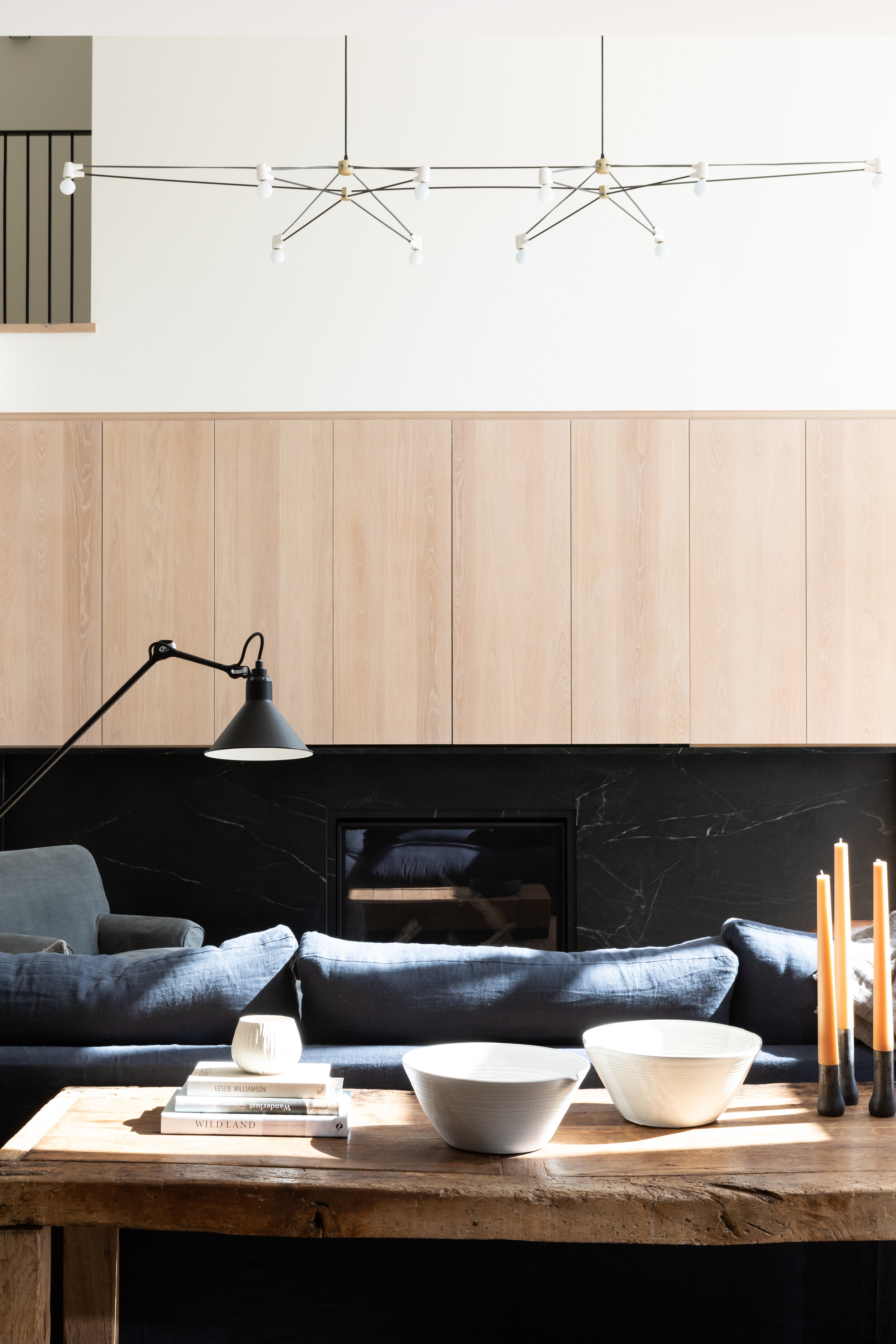 We wanted the home of this young family to feel timeless, rugged, approachable, and durable. Not precious. We aimed to balance a traditional aesthetic with a modern one. Featured in the home are custom routered doors and wide plank white oak wall paneling, reclaimed beams and rustic white oak flooring. Large expanses of soapstone and blackened metal provide a sense of stability and solidarity. Antiques are blended with contemporary furniture to emphasise a sense of timelessness.