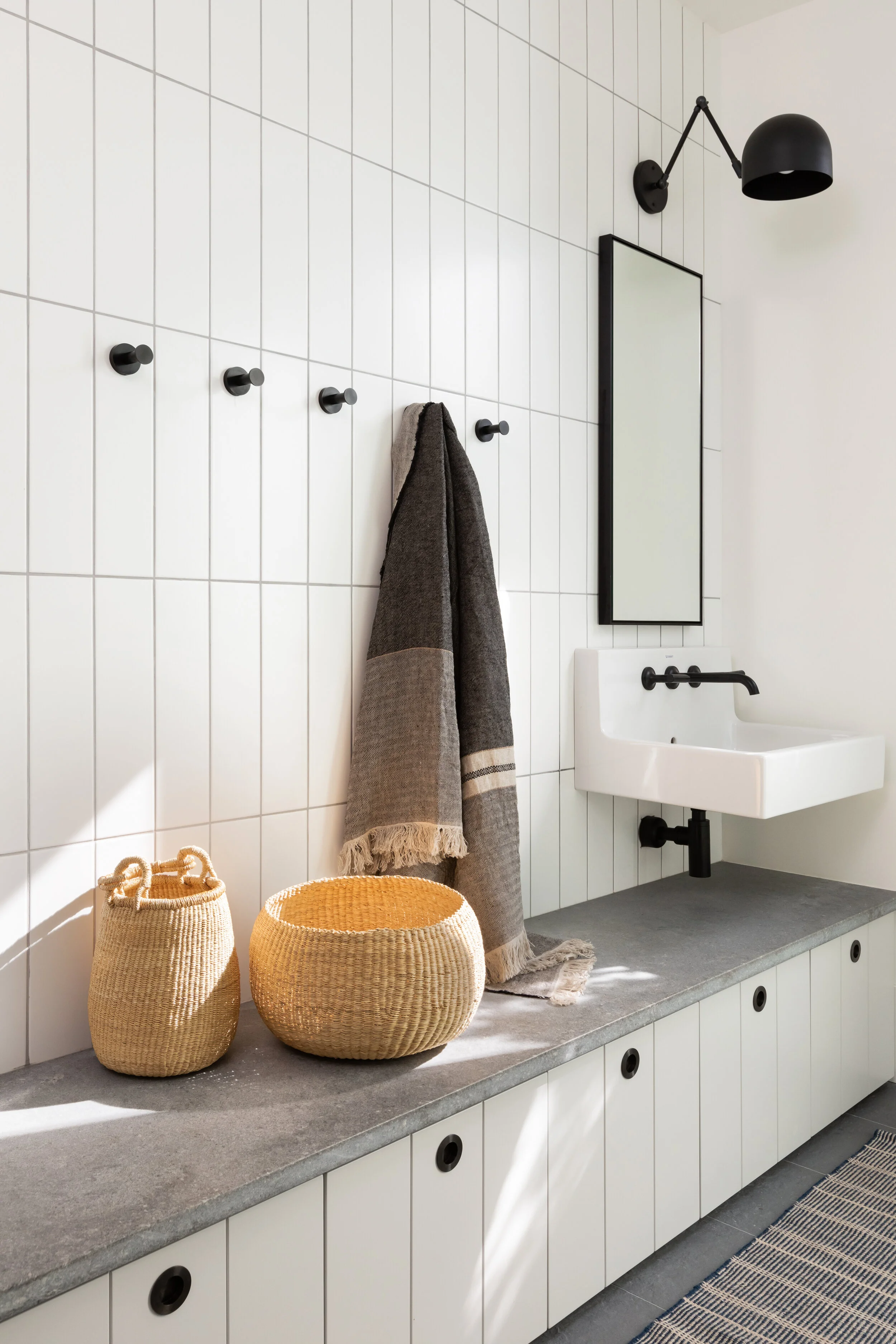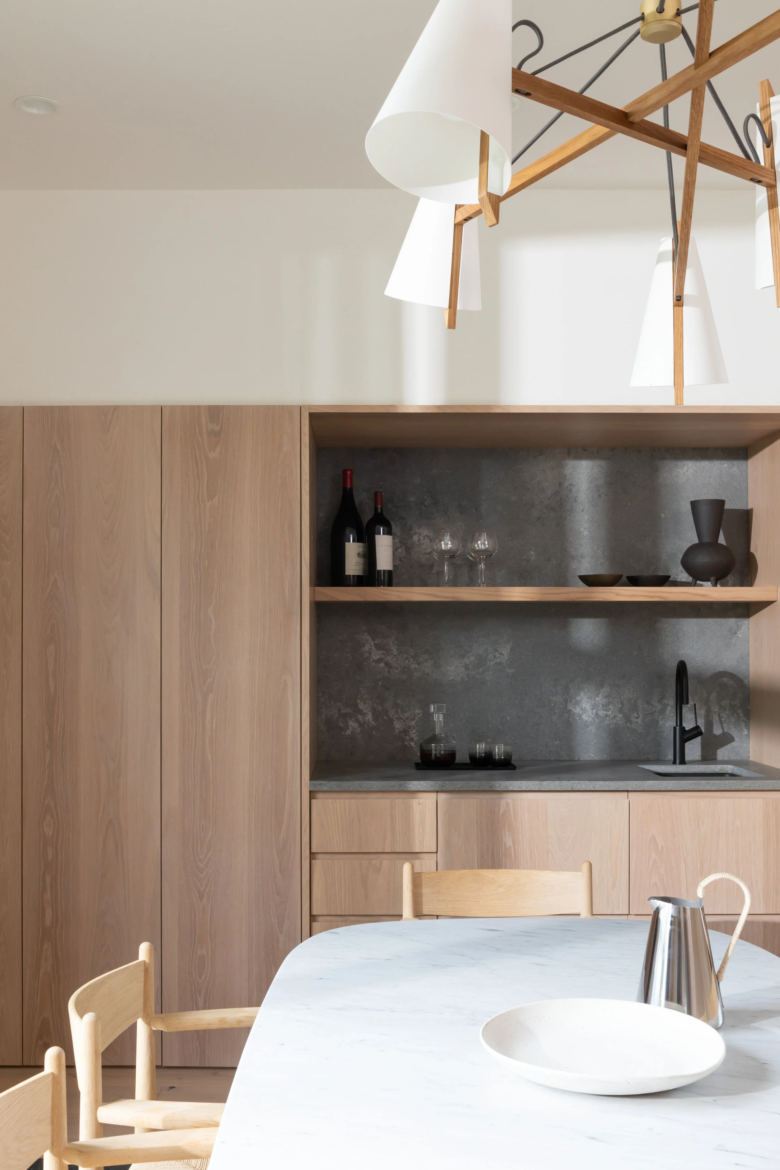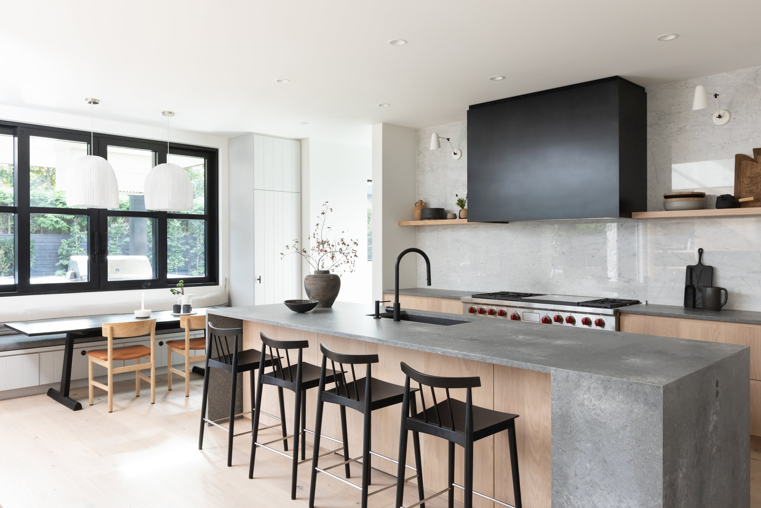 We wanted the home of this young family to feel timeless, rugged, approachable, and durable. Not precious. We aimed to balance a traditional aesthetic with a modern one. Featured in the home are custom routered doors and wide plank white oak wall paneling, reclaimed beams and rustic white oak flooring. Large expanses of soapstone and blackened metal provide a sense of stability and solidarity. Antiques are blended with contemporary furniture to emphasise a sense of timelessness.