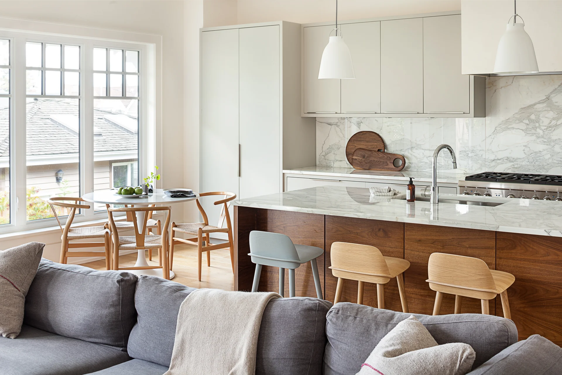 This home on Vancouver's West Side plays with the balance of modern and traditional styles. With a mandate by the city for the exterior of the house to fit in with the character of the neighbourhood, we decided that the 'envelope' details should follow suit. Therefore, we played off those traditional details by injecting a more contemporary aesthetic with cleaner lines for the interior millwork and furnishings. At the same time we wanted the home to feel warm and not too serious for this young family.